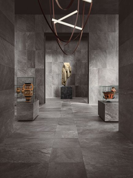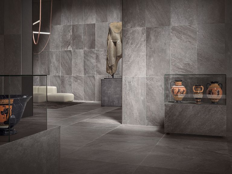 Een natuurlijke stijl met een gezochte esprit: zachte effecten van de materie interpreteren rotsen, keien, zand en vertalen zich in vloeiende oppervlakken die de grens tussen binnen en buiten overschrijden. De collectie combineert op een originele manier diverse, meer of minder geprononceerd texturen om een levendig, maar tegelijkertijd evenwichtig ritme te bereiken.