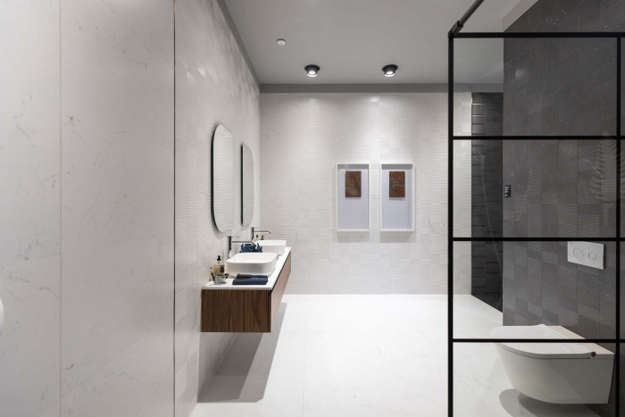 Deze maat is voor muren, maar de Fontana-collectie biedt ook porseleinen vloertegels. Voor een extra statement is de decoratieve tegel uit de collectie een must, ideaal om een opvallend centraal punt te creëren.